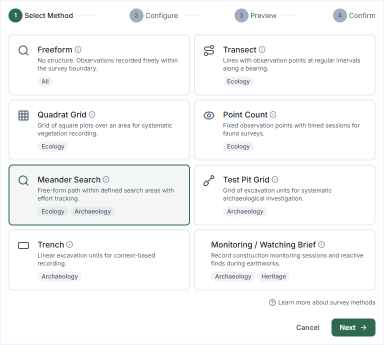 Survey methods define how data is collected in the field — whether observers work freely across a site or follow a structured spatial grid. Choosing the right method ensures your sampling is defensible and your data is statistically valid.