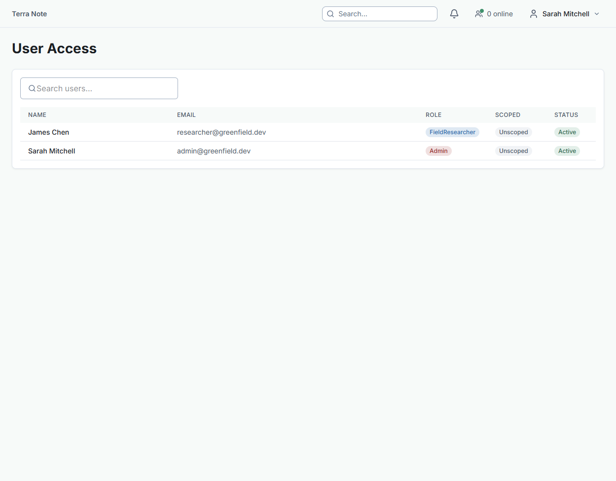 TerraSitu uses role-based access control at both the platform and project level. Getting roles right ensures field researchers can do their work while sensitive project data stays protected.